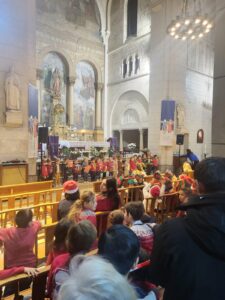 La journée commence généralement à 10h avec les chants de Noël à l’église, où chaque classe interprète un chant préparé avec enthousiasme.