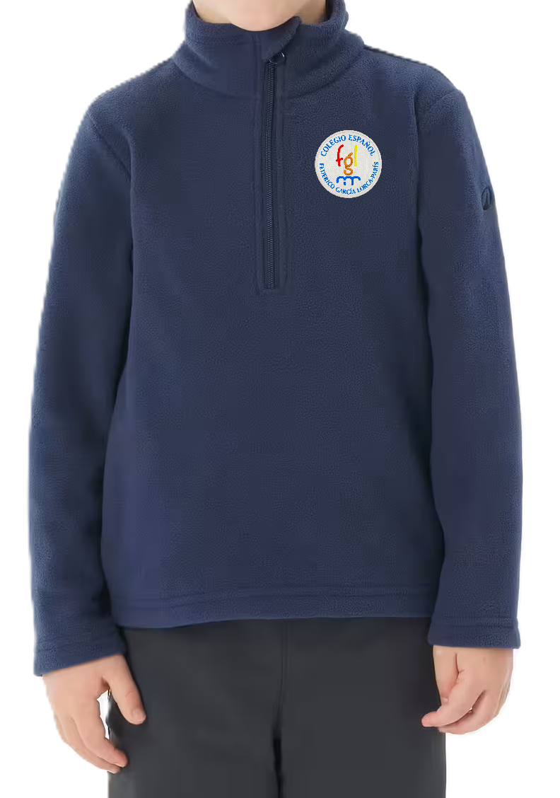 Polar azul marino (unisex): abrigado, resistente, con cierre superior, tela transpirable y parche del colegio